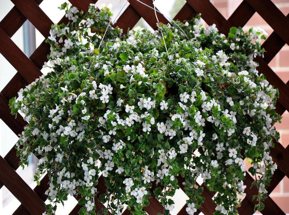 Ampel Bacopa (Sutera) е растение за катерене, което може да цъфти от март до октомври. Родината на това цвете е южната част на Африка. В домашното цветарство той започва да се използва сравнително наскоро, но бързо набира популярност поради своята красота и непретенциозност. Bacopa има дълги клони (30–70 cm), на които малки зелени или маслинови листа са подредени в симетрични двойки. Клоните растат много малки цветя с диаметър до 2 см. Всеки от тях се състои от 5 венчелистчета с бял, син, розов или люляков цвят. Животновъдите са отглеждали сортове Bacopa с големи и двойни цветя.