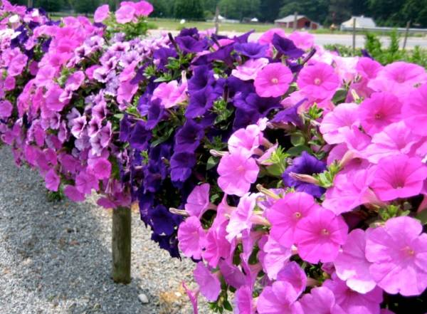- особености на формирането на храст. Както вече беше отбелязано, ампелните растения бързо образуват странични издънки, те трябва да бъдат отрязани, за да поддържат дадена форма. Тези сортове се отглеждат в висящи кошници. Каскадната петуния също расте добре, но по-мощните издънки изискват подкрепа. Само две копия на такива едногодишни форми образуват солидно цветно легло.