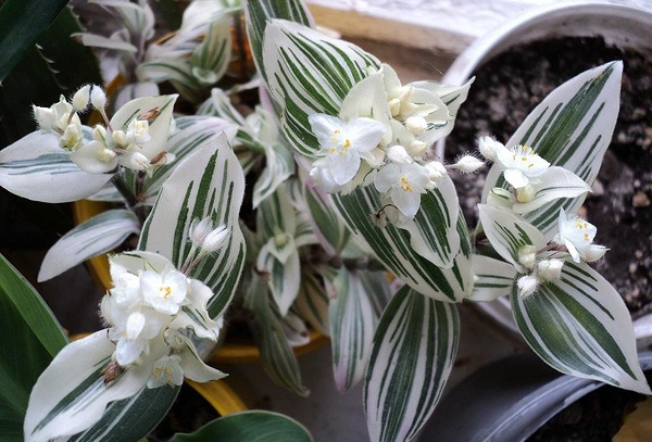 На гъвкавите издънки на белоцветните видове листните плочи са с яйцевидна или овална форма. Дължината на зелената маса достига 60 mm, а ширината е в рамките на 25 mm. Краят на листата е леко заострен. Повърхността на гладките листови плочи може да бъде едноцветна или пъстра, райета. В горните части на леторастите се образуват съцветия тип чадър, които са боядисани в бели тонове.