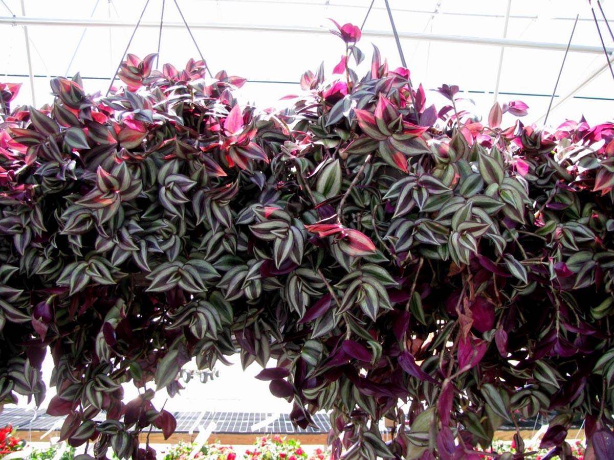 - Традесканция. Това е пълзящи, пълзящи издънки с овални листа, гъсто разположени върху тях. Цветът на листата е разнообразен. Има разновидности, при които едната страна обикновено е зелена, а гърбът е бордо. Също така някои имат бели, розови ивици. Цъфти с големи бяло-розови цветя.