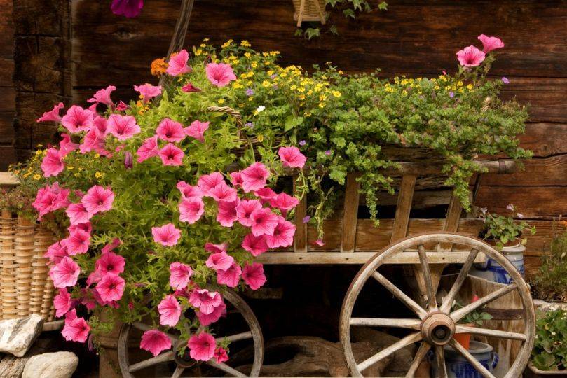 Можете да украсите старите неща с ампелни цветя, като им дадете втори шанс за живот. За дизайнера няма съмнение какво означава - ампелен, той разбира, че такива растения могат да бъдат използвани за украса на счупен велосипед, кана, малка количка, колело.