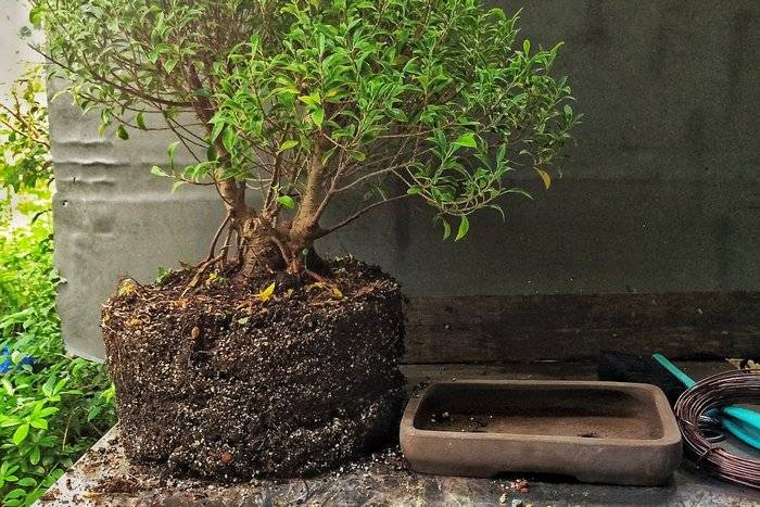За бонсай от фикус се купува специална саксия - палет с ниски страни и крака с дължина до 15 мм. На дъното на контейнера трябва да има дупки, за да се отцеди излишната течност.