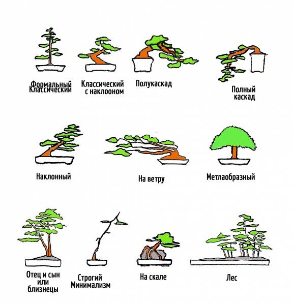 Изображенията, въз основа на които се класифицират миниатюрни дървета, са подобни на видовото разнообразие на растенията в природата. Те обаче могат да бъдат променени по време на процеса на отглеждане в съответствие с намерението на автора. Бонсай стиловете се различават по ъгъла на наклона на багажника, разположението на клоните и тяхната комбинация: