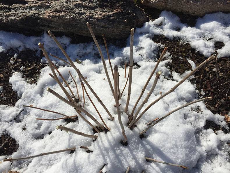 Zur Erhöhung des Vertrauens wird daher das Beschneiden der großblättrigen Hortensie durchgeführt, wenn die Knospen erscheinen. Auf diese Weise können Sie feststellen, welche Triebe den Winter nicht überlebt haben und entfernt werden sollten. Wenn der letzte Schnee schmilzt, wird der Busch vorsichtig geöffnet, sie geben ihm Zeit, sich auszurichten, und danach beginnen sie, den Busch zu kürzen.