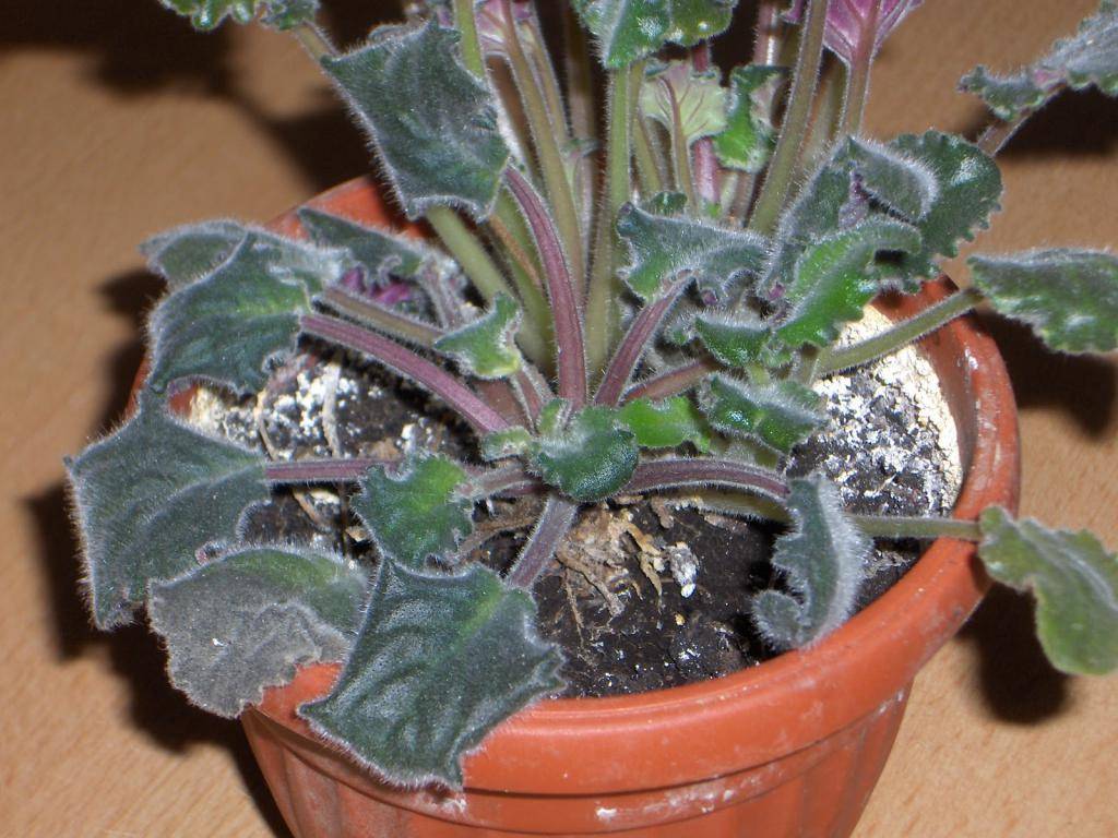 Vertikal wachsende Blätter, Flecken auf violetten Blättern, das Auftreten verschiedener Arten von Einschlüssen auf Blättern und Blattstielen, der Verlust von Turgor und Blattfarbe geben Anlass zur Sorge.