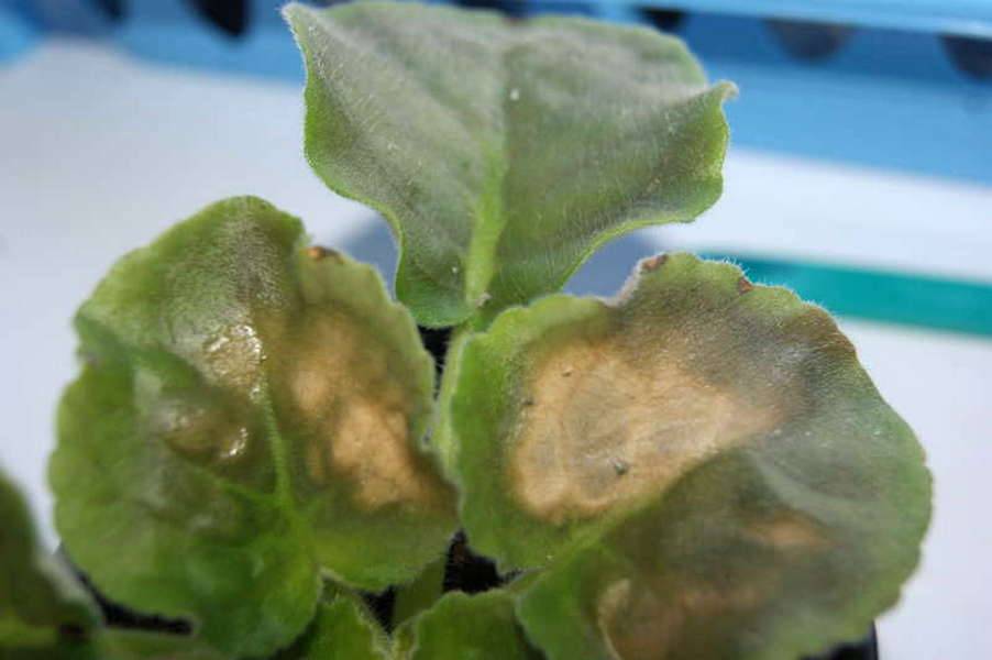 - Bei später Fäule erscheinen braune Flecken auf den Blättern des Veilchens.