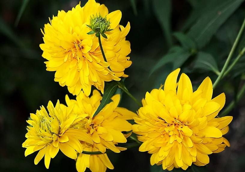 Im Vergleich zu den vorherigen Sorten handelt es sich um eine niedrig wachsende Sorte mit einer Pflanzenhöhe von nur 50-60 cm. Zusätzliche Stützen sind nicht erforderlich. Die Blüten sind gelb mit vielen Blütenblättern. Der Kern ist, wie die meisten Rudbecky, schwarz, erhebt sich nicht über die Blüte, die Blütenstände sind groß.