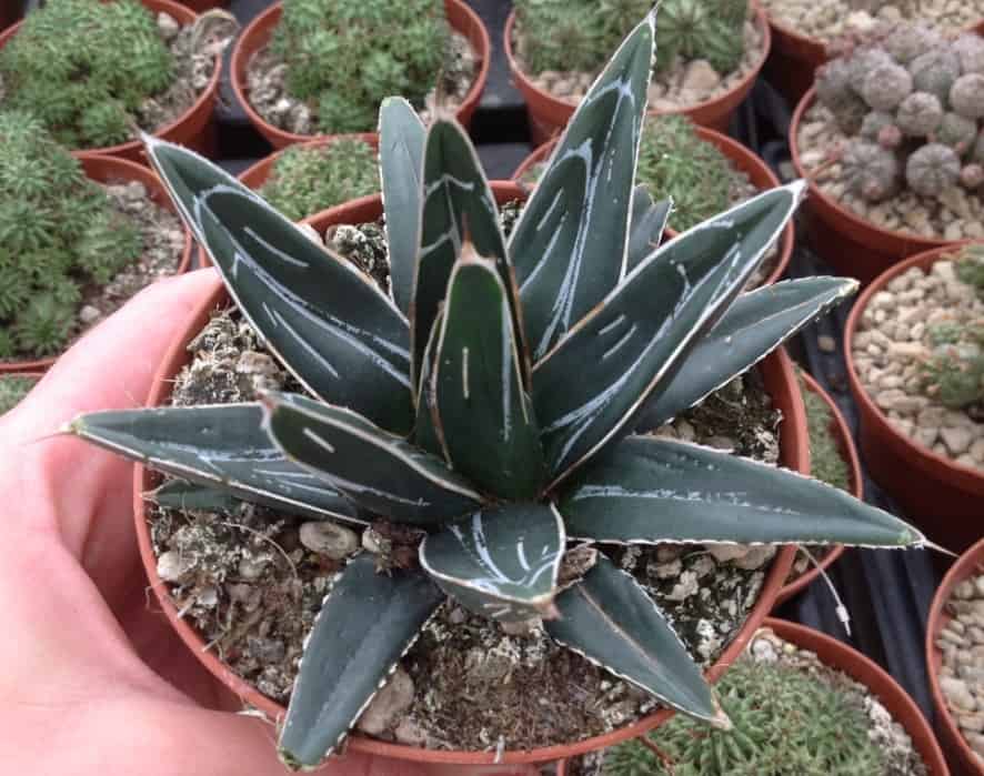Какво е агаве може да се разбере от този сорт, тъй като има най-дълъг период на растеж. Също така се отличава от колегите си с малкия си размер, с плътни розетки с диаметър до 45 см и къси листа с дължина 15-20 см. Листата на този вид са с тъмнозелена триъгълна форма, дебели и жилави с много остър край . Листата имат блестящи бели ръбове. Розетката е сферична.
