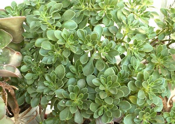 Листата на растението са месести с наситен зелен оттенък. Те са покрити с къси бледи косми и са събрани в относително малки розетки. Самите листа са малки, широки до 1 см и дълги до 2 см.