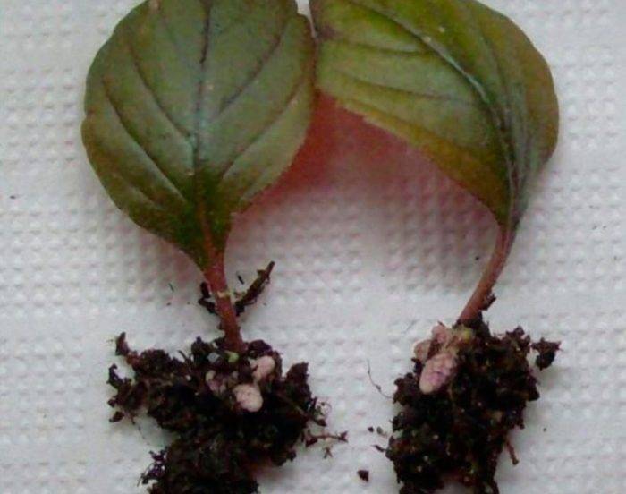 За размножаване са подходящи и здрави възрастни листа със силни дръжки. Те се потапят с дръжка до долния ръб на листната плоча в почвата и се покриват с прозрачна чаша или торба отгоре. Ще отнеме повече време за вкореняване, отколкото при издънките, но след 2-3 седмици корените трябва да се образуват. В прозрачен контейнер това ще бъде много ясно видимо. В бъдеще домашните грижи за цветето ахименес нямат основни разлики.