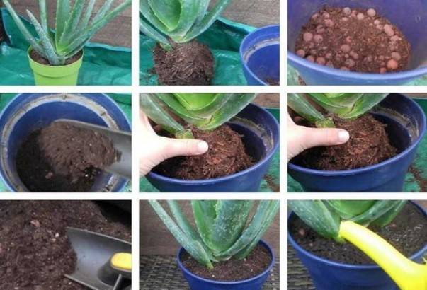 Ако короната вече е 2 пъти по-голяма от контейнера, в който расте, можете спокойно да трансплантирате алое. Трансплантацията се извършва често, тъй като храстът расте доста активно. Младите растения се трансплантират ежегодно, защото кореновата система се формира бързо и мястото в саксията може да не е достатъчно. Възрастен формиран храст се трансплантира на всеки 3 години.