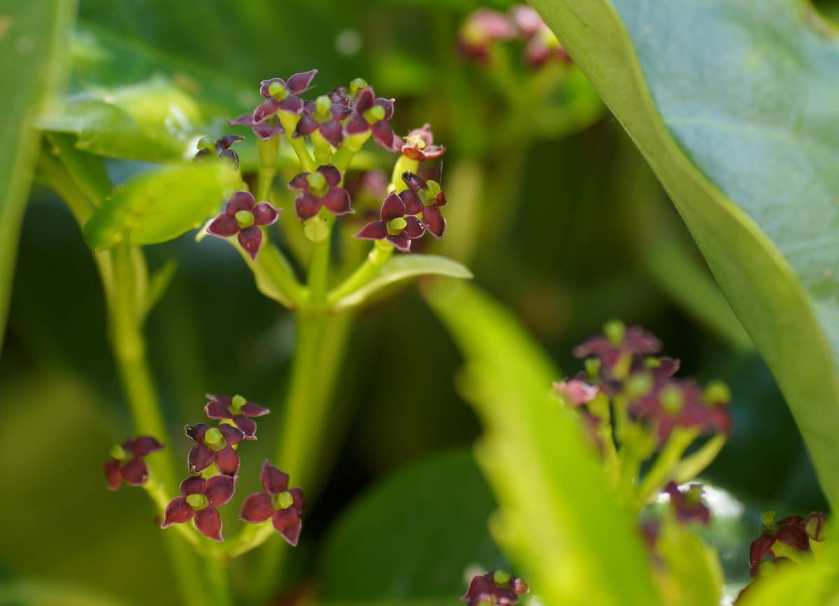 Aucuba почти никога не цъфти у дома. В редки случаи през юни се появяват неописани червени цветя. Те са събрани в малки съцветия. След това дават червени големи негодни за консумация плодове.