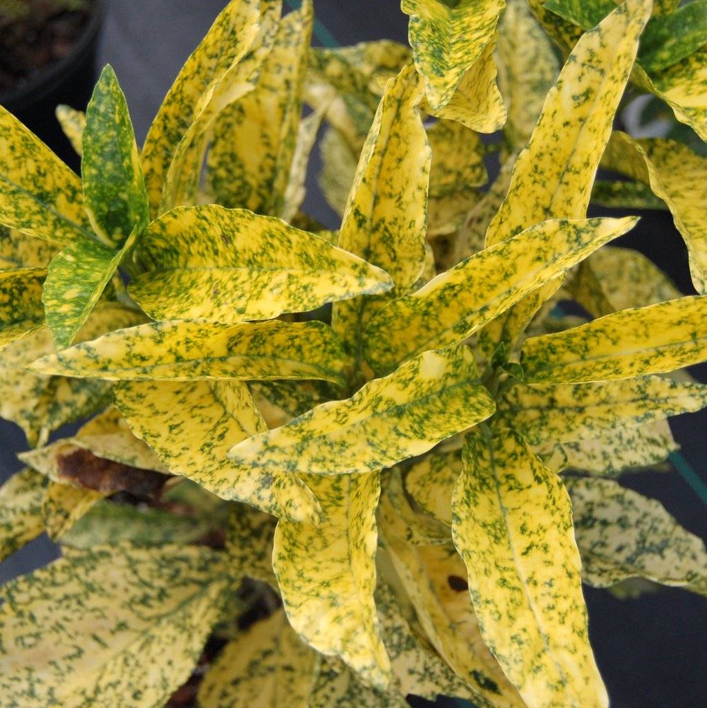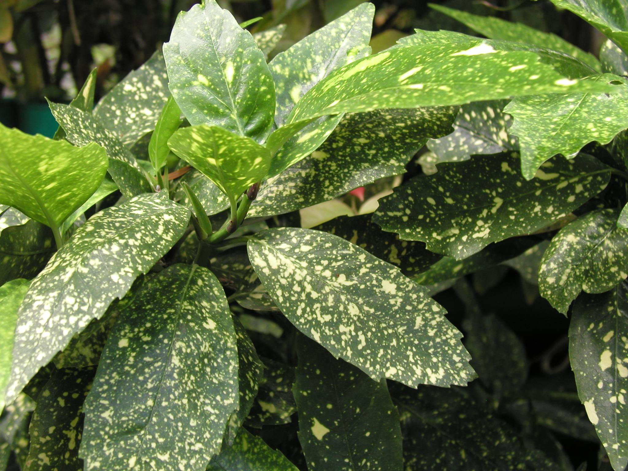 - Aucuba Crotonifolia е висок храст, който достига 3 метра ширина. Листата растат до 20 см. Точки с различни форми и те могат да се слеят в малки шарки.