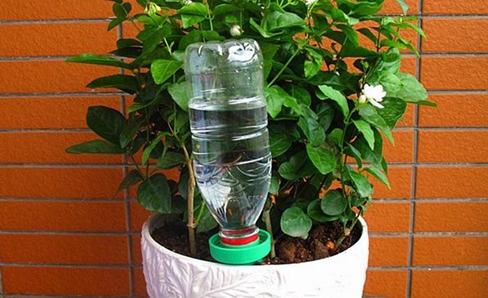 Тази опция е подходяща за големи саксии. За да направите този вид поливане, трябва да вземете пластмасова бутилка с правилния обем. Напълнете контейнера с вода, обърнете го и го залепете в земята. Постепенно водата ще се абсорбира от земята, което ще ви позволи да не поливате дълго време.