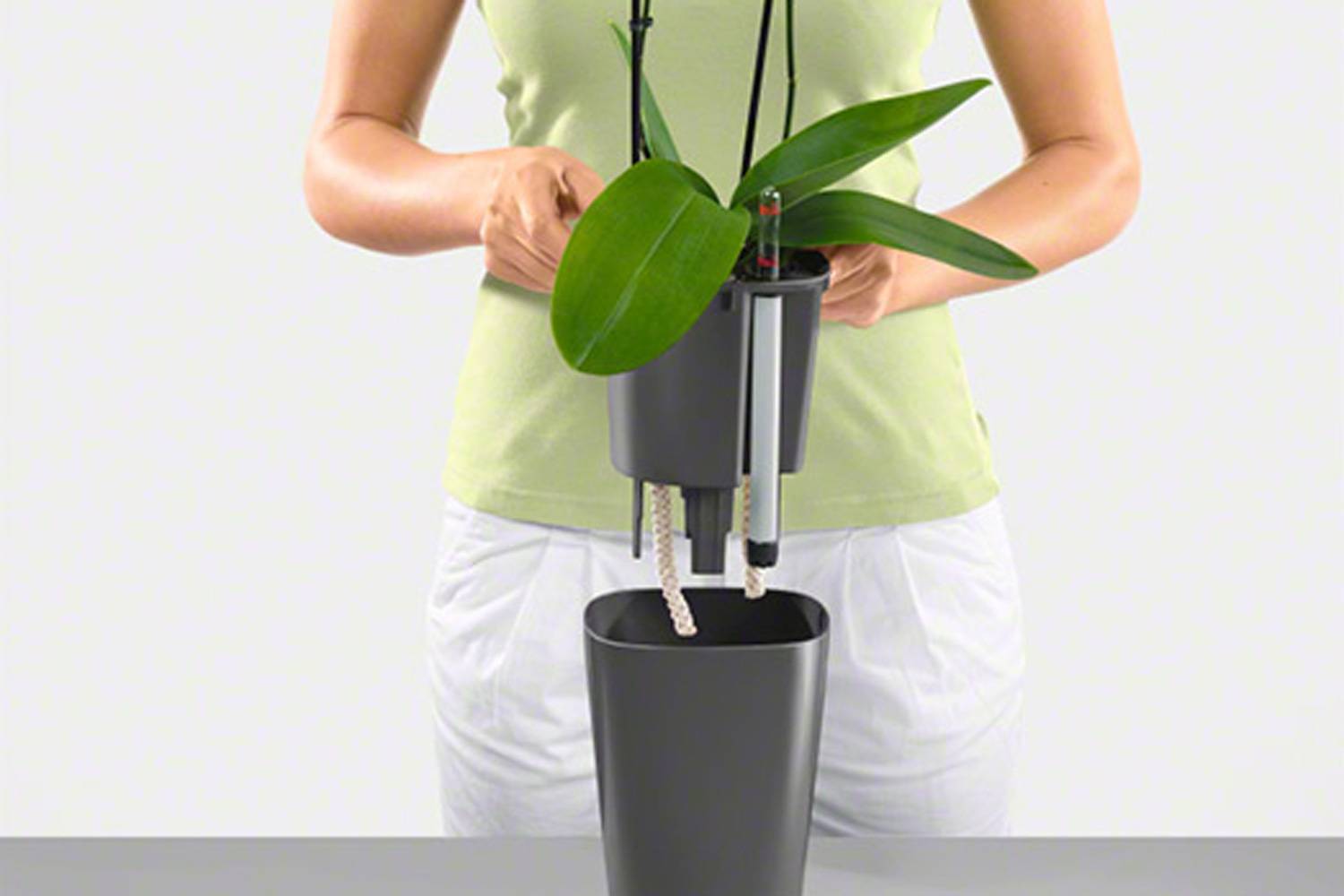 Чрез тръба водата от скрит контейнер се издига и се абсорбира от почвата, а растението е снабдено с пълна влага. Резервоарът може да се напълни, ако е необходимо, чрез малък отвор.