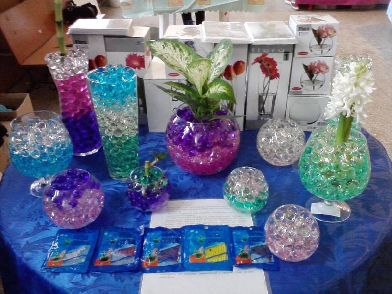 - Напълнете с вода. Малките гранули ще абсорбират влагата и ще увеличат размера си. Гранулите ще придобият желания цвят.