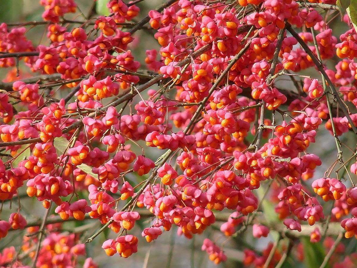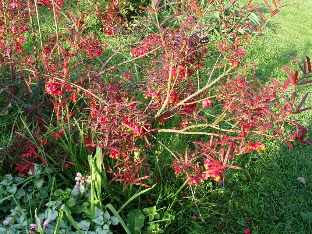 - Червена каскада (Red cascade) - дървовиден храст расте до 3,5 м височина и до 2,5 м в диаметър. Red Cascade euonymus има тъмнозелени овални листа и едва забележими жълтеникаво-зелени цветя. Декоративността се постига благодарение на листата, които през есента стават лилави и появата на оранжеви плодове.