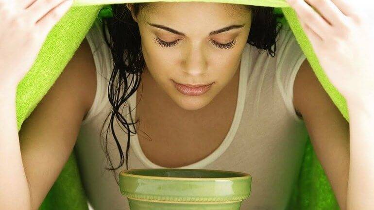 Разбъркайте 8-10 капки масло в съд с много топла преварена вода или отвара от лечебни билки. Трябва да спуснете главата си над контейнера, да се покриете с кърпа и да вдишвате интензивно парата. Процедурата трябва да се повтаря 2-3 пъти на ден до пълното изчезване на носните секрети.