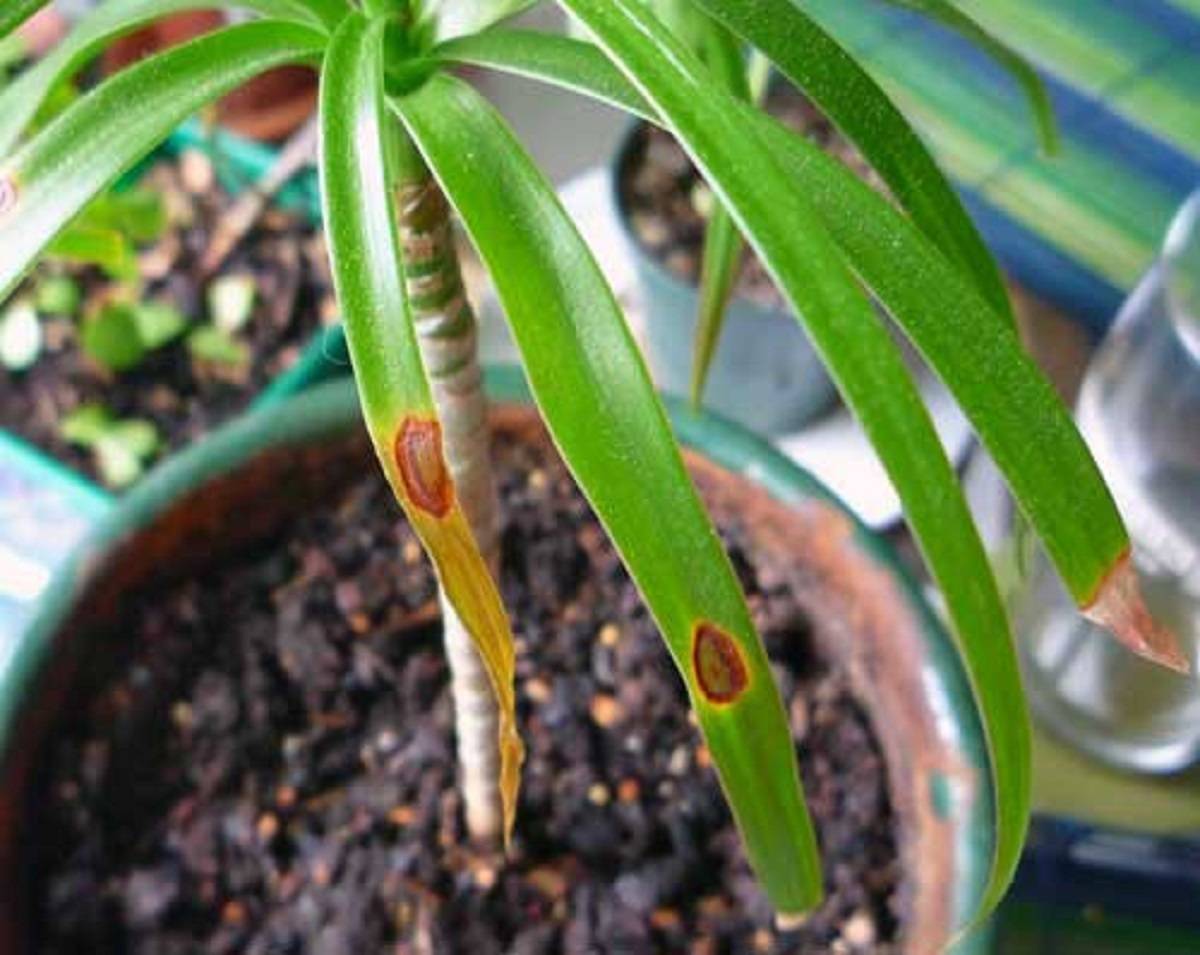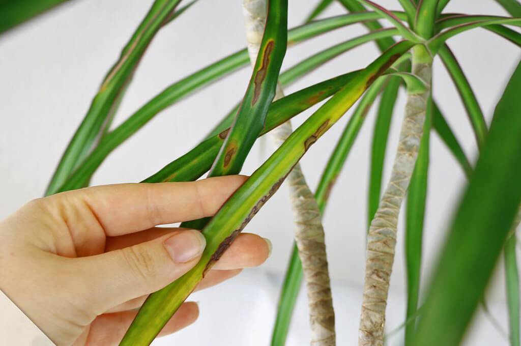 Случва се по листата на драцената да се появят кафяви петна. Това може да се случи, ако растението, докато е на перваза на прозореца, е разположено по такъв начин, че пряката слънчева светлина да пада върху листата. Това означава, че тя може да страда от слънчево изгаряне. На повърхността на листа първо има петна с ръждив оттенък, лепкави на допир. След това изсъхват. В резултат на това растението се разболява и в крайна сметка умира, когато бъде игнорирано. Можете да спасите драцената, като преместите саксията на сенчесто място и отрежете заразените листа.