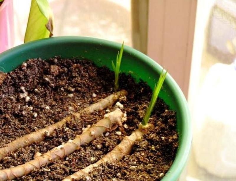 Покрива се с торба и се поставя в топло, редовно, но умерено, поливане. Тъй като растението остава жизнеспособно, въпреки загубата на зеленина, след 1-1,5 месеца млади издънки ще се появят на голия ствол. По този начин е възможно да се получат два млади цвята наведнъж, докато старото растение, от което е изрязан бъдещият разсад, ще издава няколко стъбла наведнъж, което означава, че след известно време едно от тях може да бъде отрязано и също вкоренено.