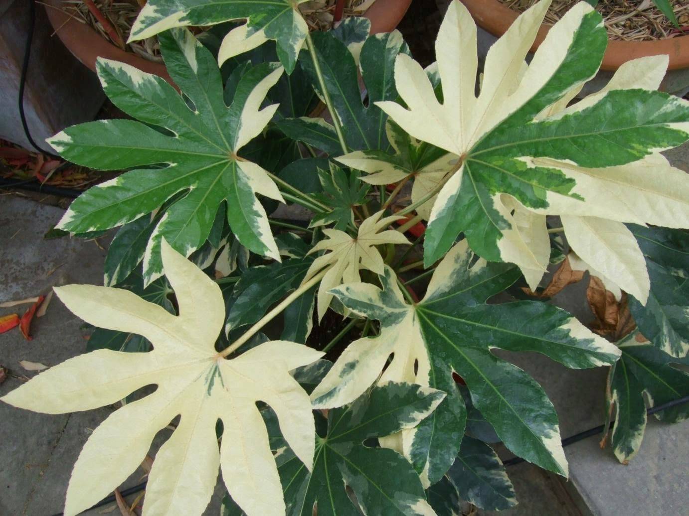 Храстите са малки: те достигат не повече от 90 сантиметра височина. Листните плочи са големи, разчленени на пръсти. Неравномерните кремави петна са разположени по цялата повърхност. Fatsia пъстри предпочита да расте на добре осветено място, в противен случай листните плочи могат да загубят декоративния си ефект.