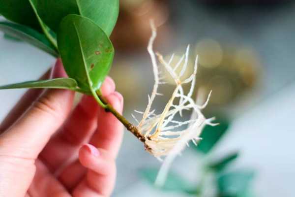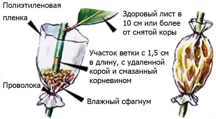 Най-трудният вариант е отглеждането на цвете с въздушни слоеве. Тази операция се извършва директно върху издънката. След като се оттегли от върха на клона 50-60 см, лента от кора се отстранява с остър нож в кръг. След това този колан се увива в мокър мъх и се покрива с филм. Последното ще помогне да се поддържа влагата, необходима за образуването на корени. След няколко месеца под разреза ще се появят корени. След това младото растение се отрязва от клона и се засажда в отделна саксия.