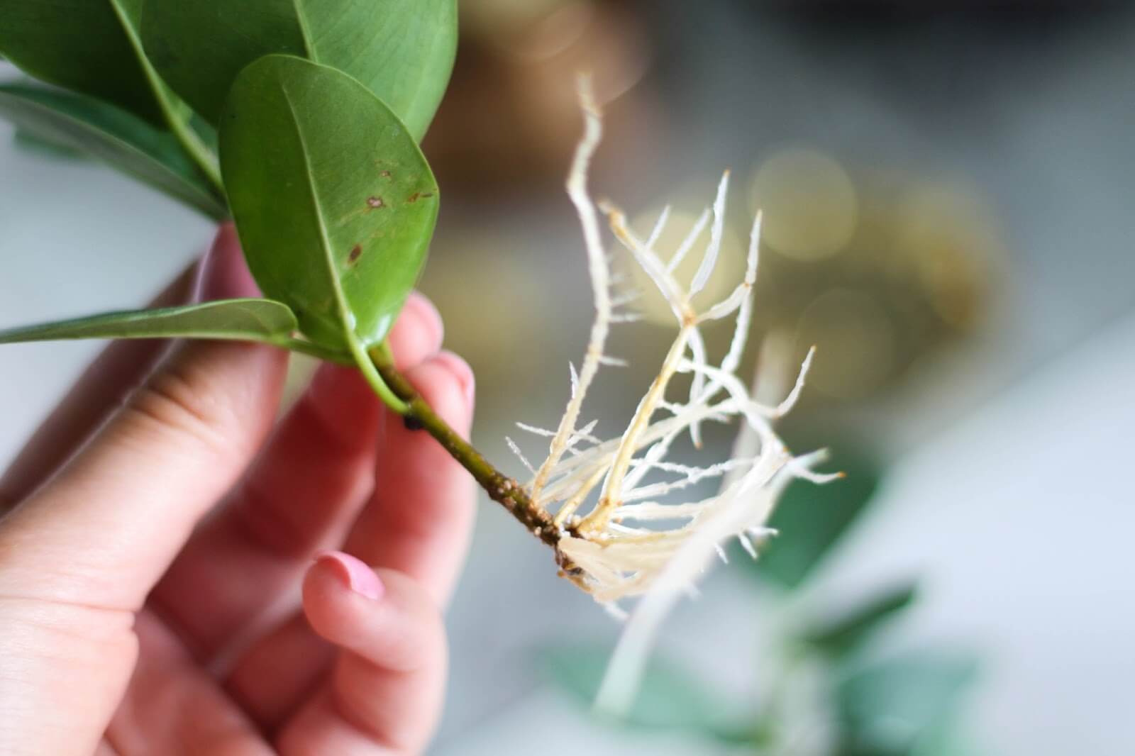 - дръжте резника в съд с вода, докато се появят корените. Това обикновено отнема от две седмици до месец. Инсталирайте контейнера на светло място, но без пряка слънчева светлина. Температурата на въздуха трябва да се поддържа на 25 ° C, а влажността да е 80%. Необходимо е да се изключи контактът на листата с вода, за да се избегне тяхното гниене;