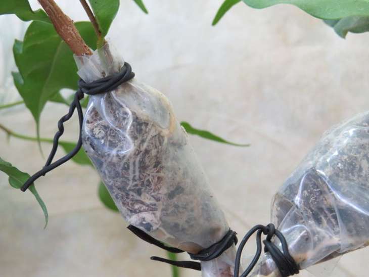 Описание на този вид размножаване: необходим е прав и силен издънка, от която трябва да се отстранят няколко листа. Около издънката трябва да направите кръгов разрез и да прикрепите мокър мъх към това място. След това го увийте със стреч фолио и го закрепете на възли от двете страни. Мъхът трябва да е постоянно мокър.