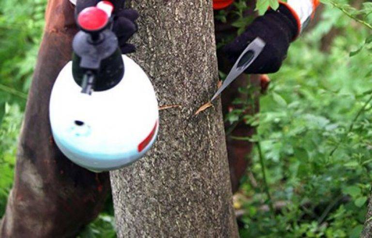 Чрез разрезите трябва да се обработват дървета с дебела кора. Нарезите се правят под ъгъл с брадва. Работата се препоръчва да се извършва при сухо и спокойно време.
