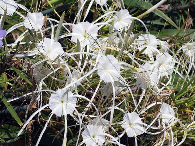 Крайбрежният хименокалис (Hymenocallis littoralis) може да се намери в блатистите гори на Мексико, Перу и Бразилия. Продълговатите листа с дължина 40-70 см имат характерна сивкава широка ивица в центъра. Съцветията са сходни по форма с цветята на нарциса.