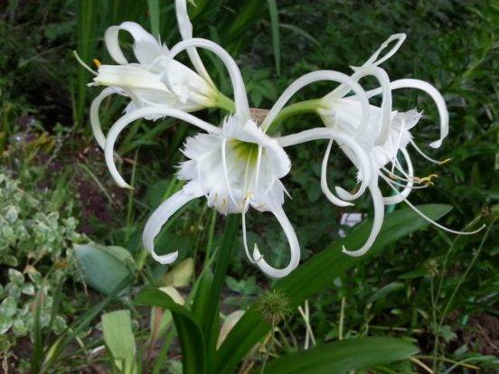 Цветята под формата на отворен чадър със снежнобял цвят имат изискани и грациозни венчелистчета, достигащи дължина до 11 см. Благодарение на венчелистчетата си растението получава второто си име паяк лилия. Всъщност венчелистчетата наподобяват дългите крака на паяк, висящи от извити сиво-зелени дръжки. Дължината на един дръжка варира от 30-40 см, съдържа от 7 до 10 цветя.