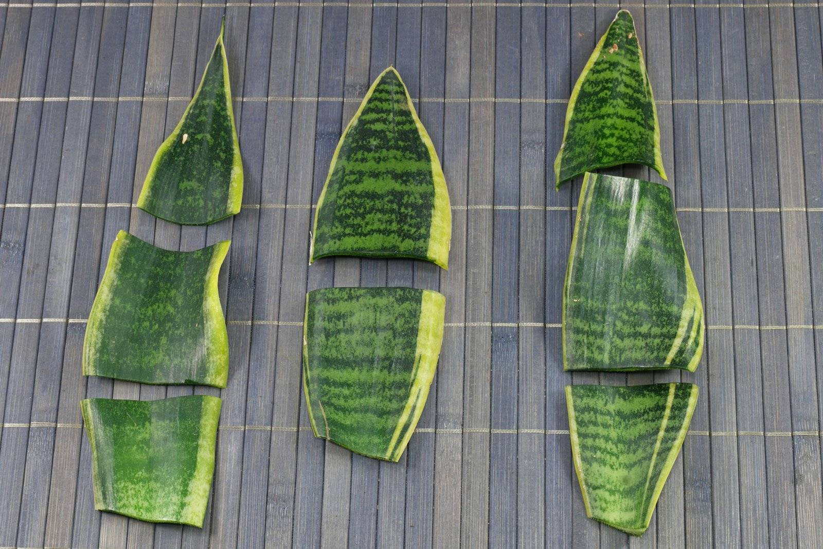За цветето на сансевиерията размножаването на листа е един от най-често срещаните методи. Благоприятният резултат от размножаването зависи от това дали листът е избран правилно. Така че, за тази процедура си струва да изберете здрав лист от изхода, в който вече не се наблюдават нови листа. Листът трябва да се нарязва на няколко парчета по около 10 сантиметра всеки.