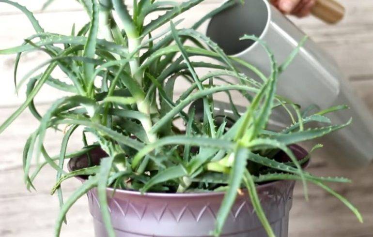 - Земята с възрастни растения се полива обилно от лейка, като се избягва контакт с листата - натрупването на течност в гнездата на алое може да доведе до гниене на стъблото. За да може почвата да поеме цялата влага, тя предварително се разхлабва. Няма нужда да насочвате потока вода към корените - това може да ги изложи.