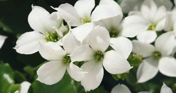 Цъфти обилно със снежнобяли цветя. Вътрешната част на цветята в основата има зеленикаво-жълт оттенък.