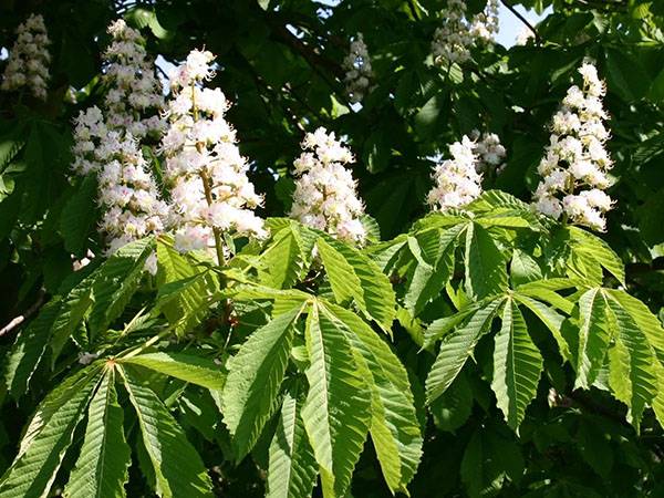 Когато кестенът цъфти, е невъзможно да откъснете поглед от него. През май цялото дърво е украсено с изправени съцветия от бели камбановидни цветя с розови петна. Съцветията се издигат нагоре, наподобяващи големи бели свещи. Можете да се възхищавате как конският кестен цъфти в началото на лятото.