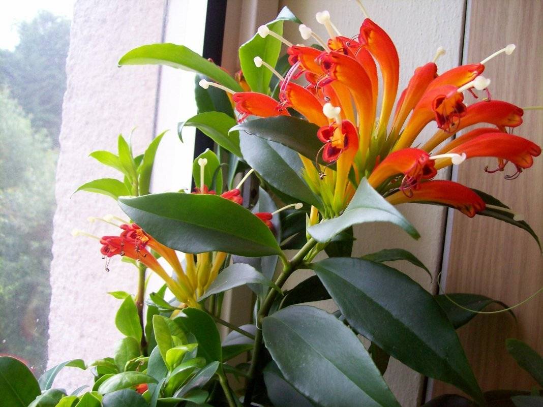 Домашното червено цвете на Колуми се отглежда във висящи саксии като ампелно растение.