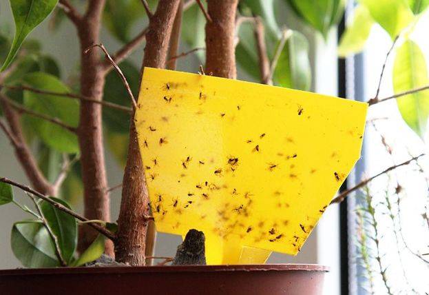 - Капаните са лепкави. Закачете лепкава лента за мухи или капан за лепило за насекоми до заразения храст. Устройството ще може да премахва летящи индивиди. Капаните са подходящи за малки мошки.