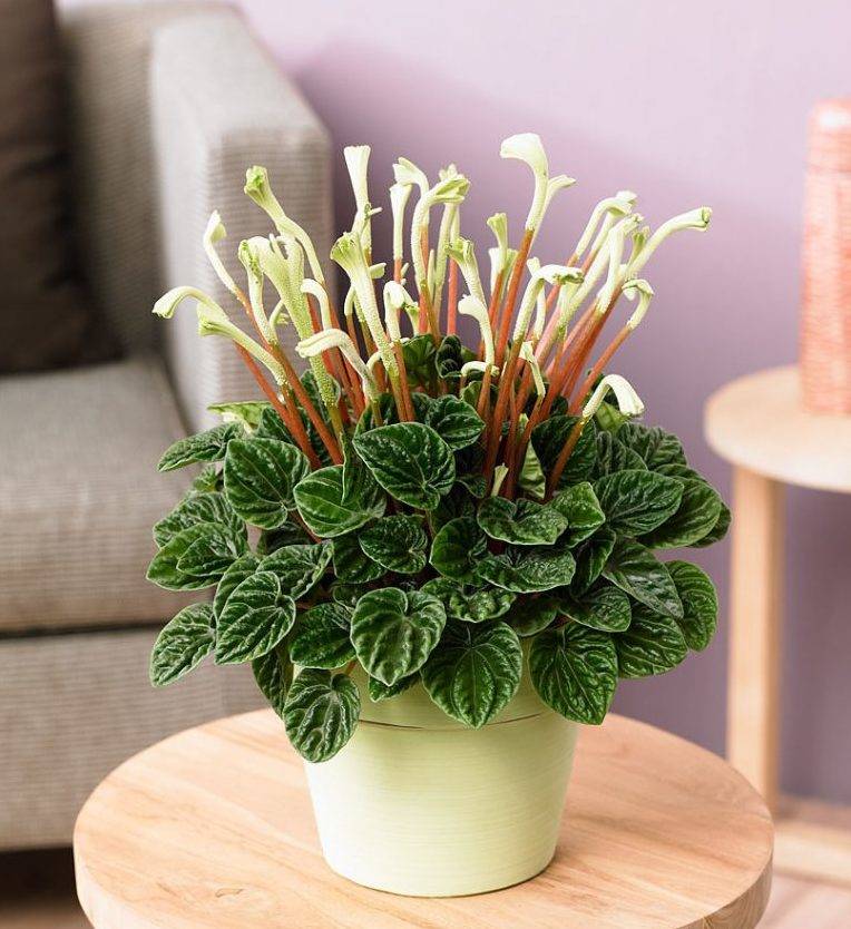 Необичайна ампелна пеперомия головата изглежда много красиво в окачена саксия. Нежните месести червени стъбла са покрити със заоблени леко продълговати светлозелени листа. Вените по листа са малко по-леки, следователно те създават модел.