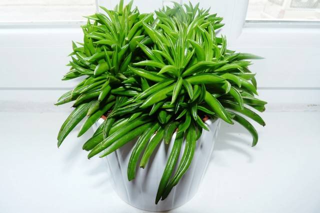 В превод звучи като "щастлив боб". Листата на този вид са дълги и тесни, свити навътре. Те са подобни на бобовите шушулки. На изправеното стъбло шушулките на листата са разположени много плътно и създават красива заря на зеленина в саксията.