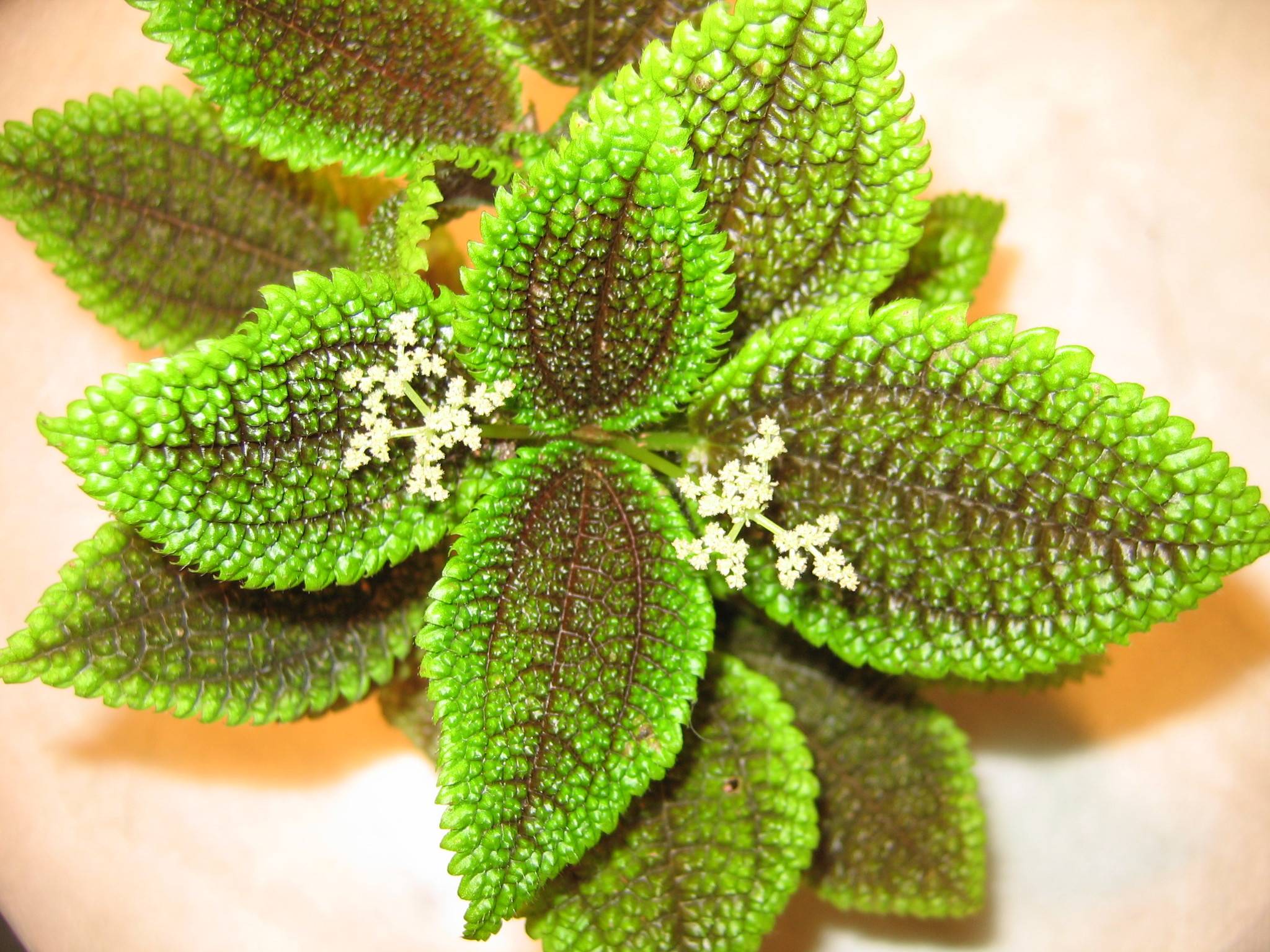- Pilea ливански. Отличителна черта на този сорт са малките листа, разположени по-близо до върха на цветето. Той има бяло-розови съцветия от малки цветя, извисяващи се над основната зеленина.