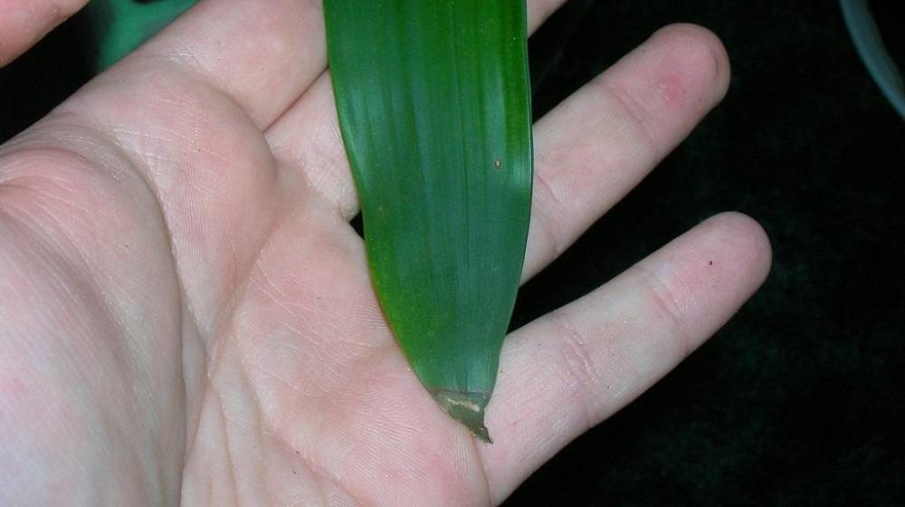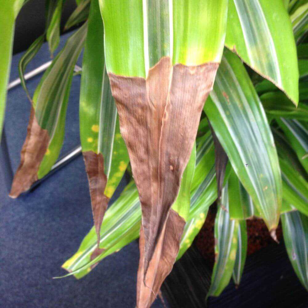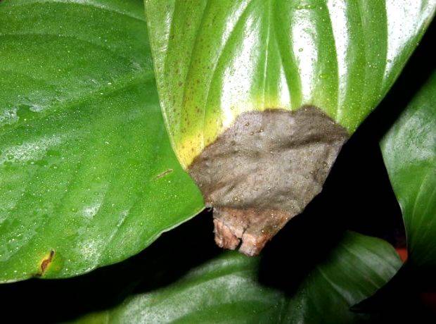 Преди да закупите растение, препоръчително е да се информирате за неговите предпочитания, по-специално за количеството вода, което консумира. Първата реакция на цветето при твърде много поливане е кафявият цвят на края на листа. И ако проблемът е бил идентифициран правилно, трябва да се предприемат редица такива действия: