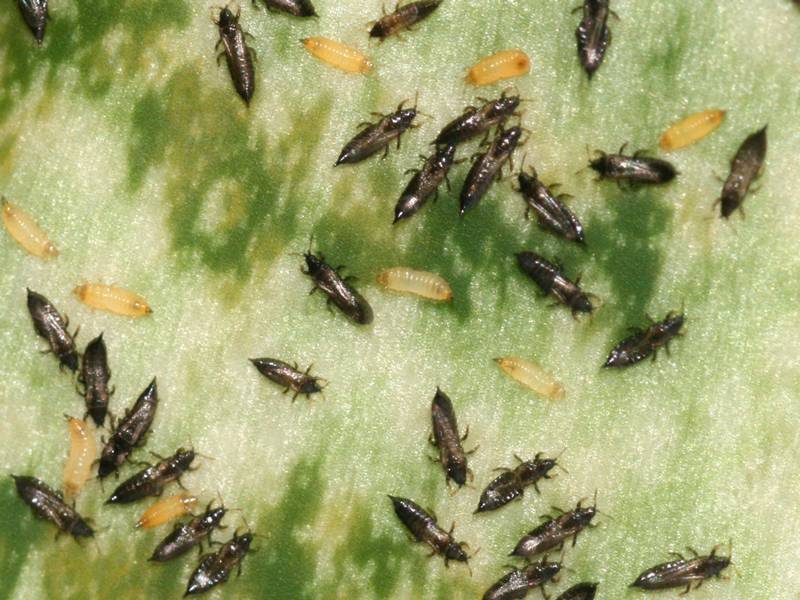 - Трипс. Насекомите растат във вътрешните тъкани на растението. Те са в състояние да унищожат цвете за възрастни за 20-25 дни. Женските най-често атакуват растения с големи, дълги листа, например драцена, палма, някои сортове фикус и др.