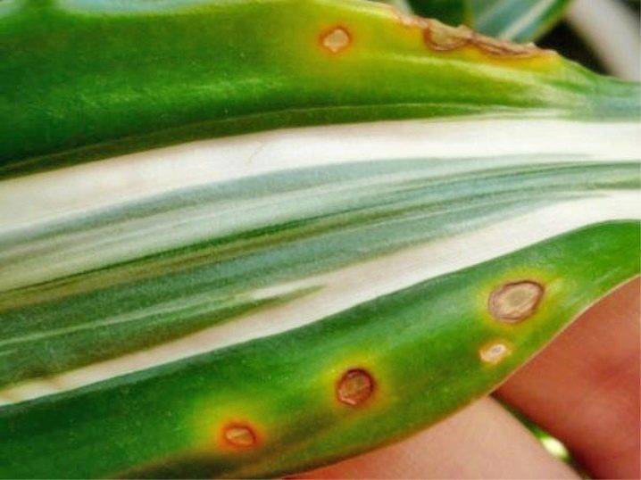 - щит. На всички части на растението се появяват характерни малки (1-3 mm в диаметър) заоблени кафяви плаки. В тях се крие вредител. Зелените тъкани около тях придобиват жълто-червен цвят. Най-ефективната контролна мярка е двукратно лечение с актар на интервал от 5-7 дни;