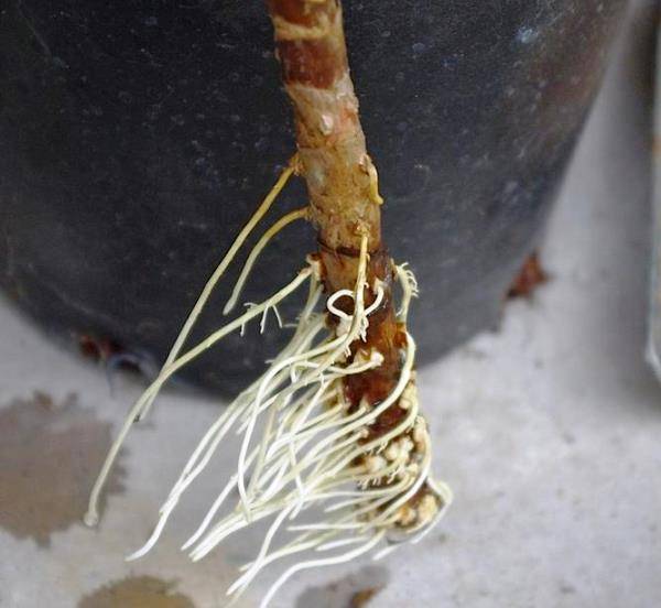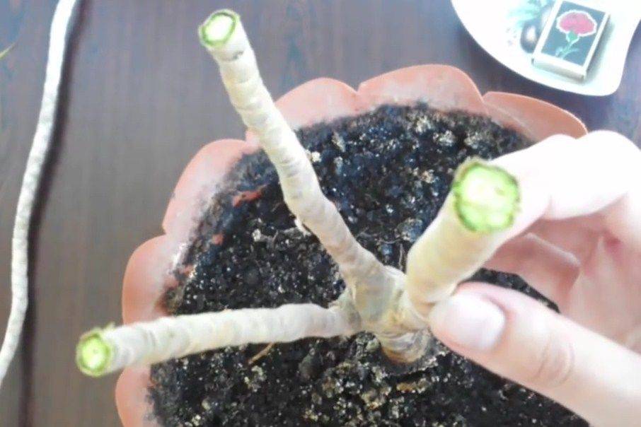 - цевта се счупи. Няма значение. Необходимо е да се отреже точката на счупване с остър резач, за да се получи ряз, строго перпендикулярен на багажника. С разтопен восък за свещи или градински лак парафинът се запечатва, за да се предотврати изсъхването му заедно със здравата здрава тъкан. Поливането се намалява с 2-3 пъти. Месец по-късно пъпките трябва да се събудят близо до почивката, от които 2 до 5 нови издънки ще растат на ствола в рамките на една година. Счупената корона може да бъде вкоренена във вода или веднага в земята;