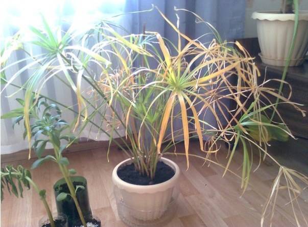 Неправилната грижа за циперус, лошото хранене и лошото поливане водят до смъртта на растението. Цветето сигнализира за проблем, като отделя короната. Поливането с много студена вода може да увреди коренището на културата и надземната част без хранене ще започне да пожълтява и умира.