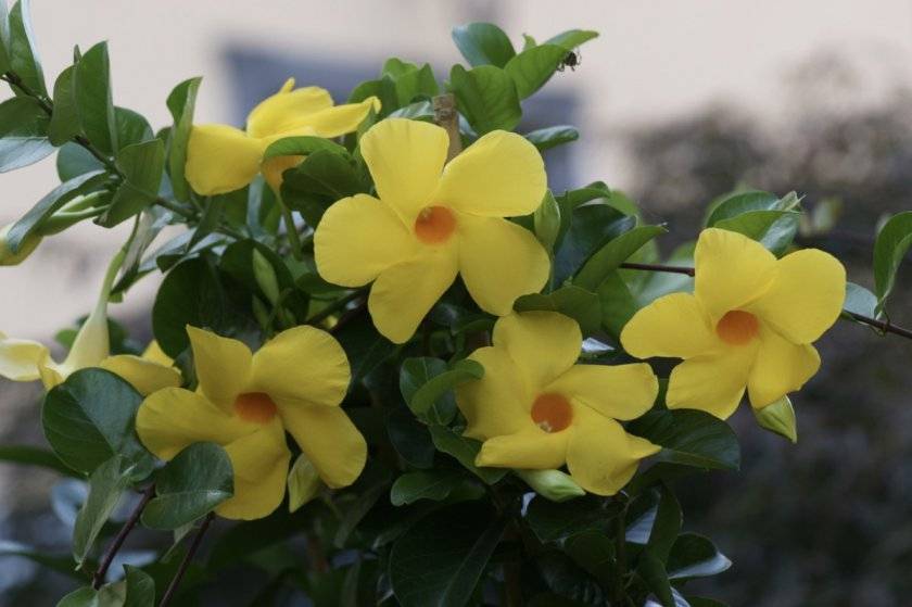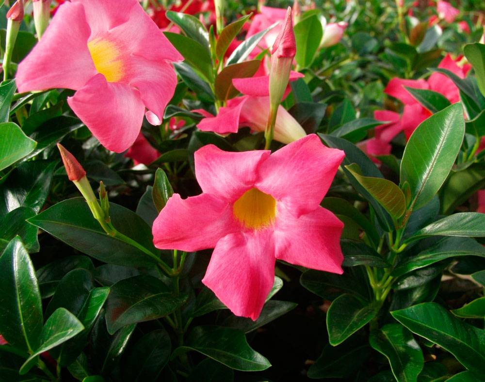 Къдравите стъбла на Мандевил са обсипани с цветя. Изглежда просто: пет листенца се отварят като грамофон, с диаметър до 10 см. Те са бели, розови, розово-червени. Цъфтят 10 дни, след което се заменят с нови цветя.