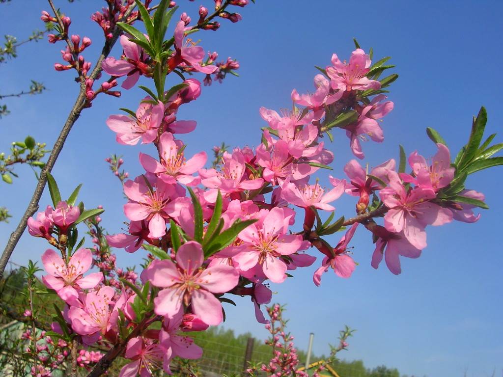 - Бадеми - той е висок, среден и джудже средно от 4 до 6 м височина. Произвежда вкусни сладки или горчиви плодове, но цветята му също са доста красиви. Всяко цвете достига 2,5 см в диаметър, има 5-7 розови или почти бели венчелистчета. Бадемите предпочитат да цъфтят през май, когато по клоните все още няма листа.