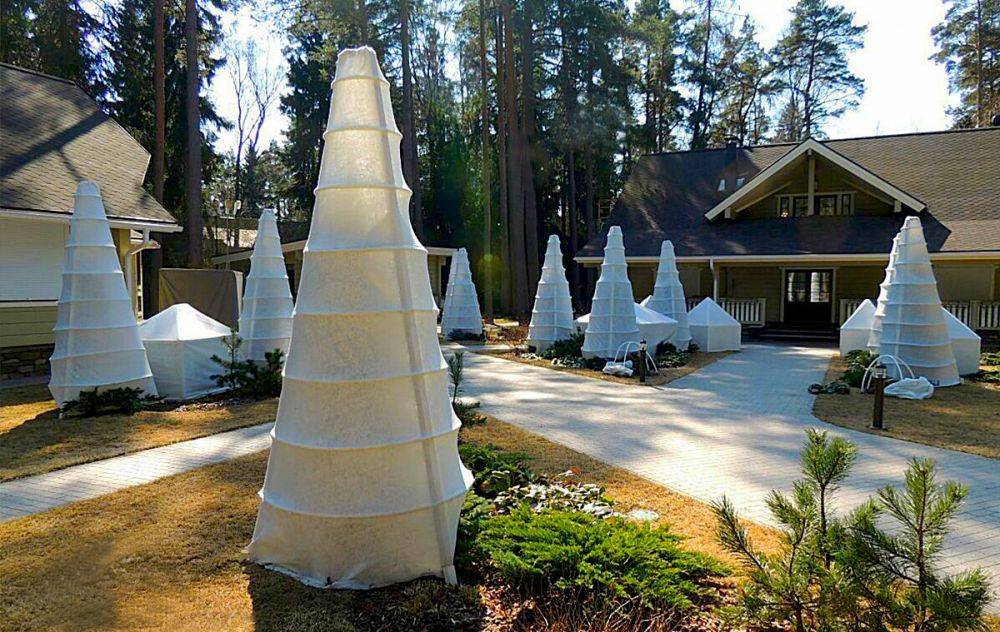 В допълнение към покриването на долната част на храста със смърчови клони, ще ви трябва подслон със специален градински дишащ материал. През пролетта си струва да го премахнете постепенно, така че суровата слънчева светлина да не окаже пагубно влияние върху растението, което е свикнало да се здрачи през зимата.