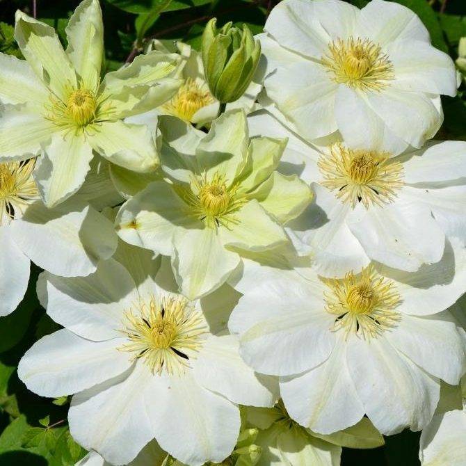 Тази група включва клематис Гернси крем с бели цветя, цъфтежът му е изобилен, два пъти в сезона. Виден представител, червеният клематис Руж кардинал, също отговаря на описанието на групата. Наситените му червени цветя се отварят отново през есента. Розовата гама от тази група е представена от Clematis Little Mermaid с изключителен сянка на сьомга.