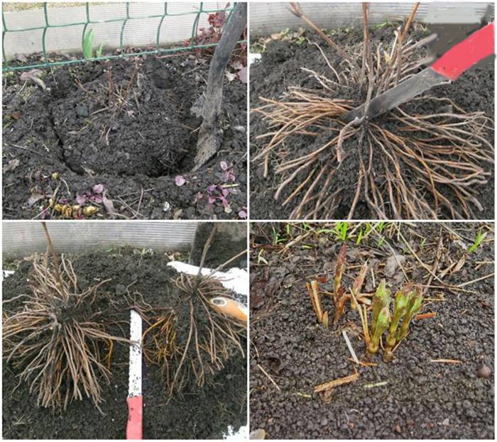 Бушът се изкопава с буца земя, корените се освобождават внимателно. Те разделят храста с остър нож, така че да останат 2-4 издънки на всяко разделение. Получените резници трябва да бъдат засадени на открито.